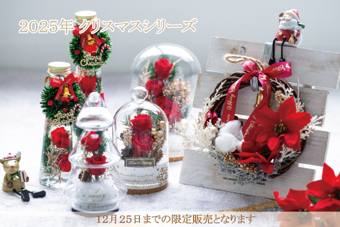 今年もクリスマス限定商品の販売を開始致しました。店頭にて、プリザーブドフラワー・ハーバリウム展示しておりますので、是非お手に取ってご覧ください。12月25日までの限定販売となります。